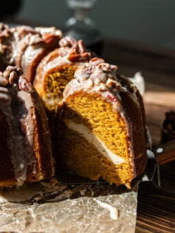 MOIST Vegan Pumpkin ‘Cream Cheese’ Bundt Cake with Maple Pecan Glaze