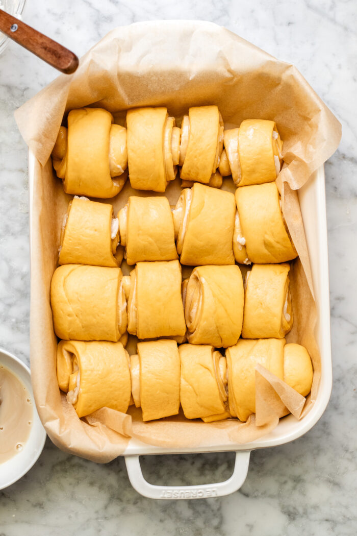 - Make the “egg” wash: once the rolls have risen and the oven is preheated, mix together the dairy free milk and maple syrup for the bread wash. Use a pastry brush to lightly brush the mixture over the tops of the rolls.