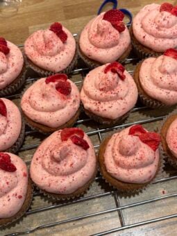 Using freeze dried strawberries (blitzed in a food processor) in lieu of fresh strawberries is the move. If you can’t find freeze dried strawberries, you can use strawberry preserves (NOT strawberry reduction) or a strawberry jam– these both work for making an amazing vegan strawberry buttercream (like my blueberry frosting recipe).