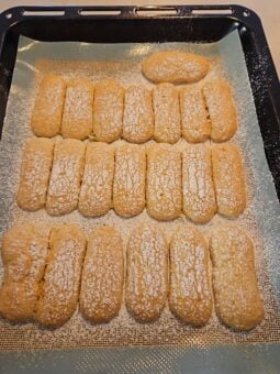 - Bake the ladyfingers: Place the baking sheet into the oven to bake for 12 minutes. They’ll be lightly golden. For crispier cookies, bake for another 2 minutes. Ten remove from the oven and set aside. Set the ladyfingers aside to cool completely. They’re even better if used the following day.