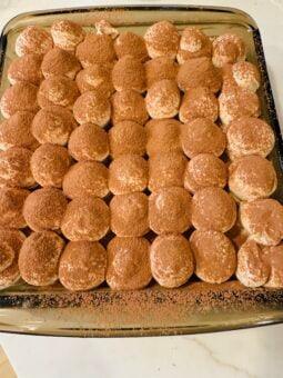 - Assembly: brew the espresso and make sure you have a 6×9″ or 8×8″ baking pan. Remove the mascarpone from the fridge. Dip one ladyfinger into the espresso, and be careful not to soak it too much. Just make sure it’s entirely covered in the espresso. Remove the ladyfinger from the espresso and place in the dish. Repeat with the half of the ladyfingers until the first layer is complete. You’ll have half for the second layer. Spoon half of the mascarpone on top of the first layer of lady fingers. Repeat for the second layer, dipping the ladyfingers into the espresso, topping with mascarpone.